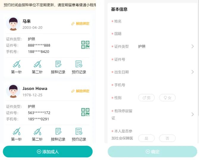 4、进入成人档案列表,点击下方的“添加成人”,填写档案信息并点击“确定”,完成档案创建。