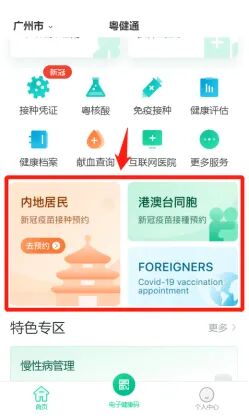 2、在“粤健通”小程序首页,找到新冠疫苗预约专区,选择相应的预约通道。