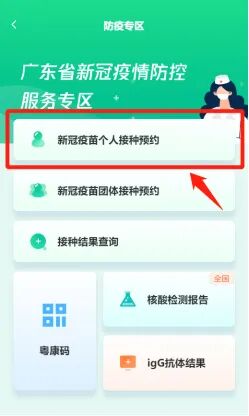 3、进入广东省新冠疫情防控服务专区,点击“新冠疫苗个人接种预约”。