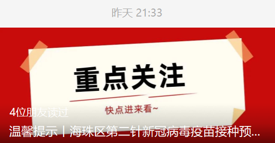 预约服务只针对于低风险区域群众开放,不预约不接种。为有效分流人员、避免人群聚集,海珠区全部接种点实行预约接种,不现场派号。