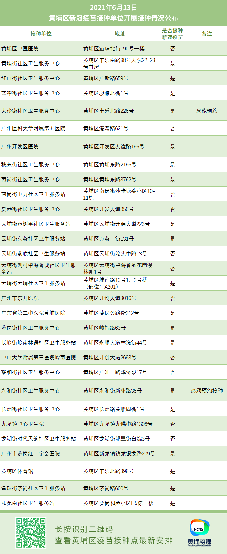黄埔区疫苗接种点安排如下