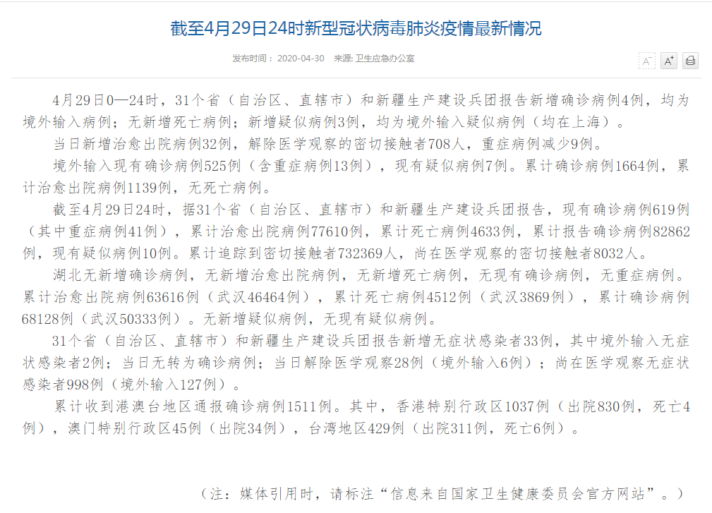 4月29日0—24时,31个省(自治区、直辖市)和新疆生产建设兵团报告新增确诊病例4例,均为境外输入病例;无新增死亡病例;新增疑似病例3例,均为境外输入疑似病例(均在上海)。