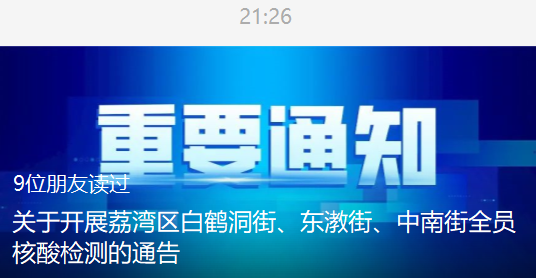 6月13日晚上21时26分,广州荔湾发布微信公众号发布《关于开展荔湾区白鹤洞街、东漖街、中南街全员核酸检测的通告》,
