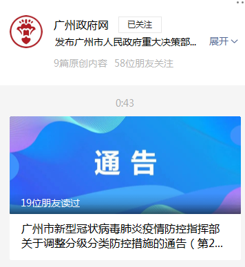 今天(14)日零点,广州政府网微信公众号发布“广州市新型冠状病毒肺炎疫情防控指挥部关于调整分级分类防控措施的通告(第20号)”。通告指出:为进一步精准科学实施疫情防控,根据防控工作进展,按照分类分批原则,对封闭、封控管理区域实行有序解封。