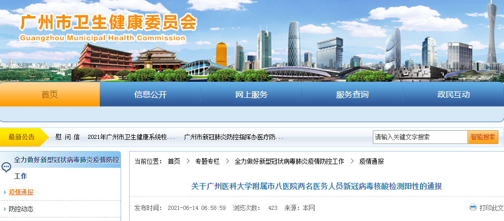 据通报,6月11日晚,广州医科大学附属市八医院在对医务人员进行的例行新冠病毒核酸检测中,发现两名阳性感染者。接报后,相关部门及时进行处置。有关情况通报如下: