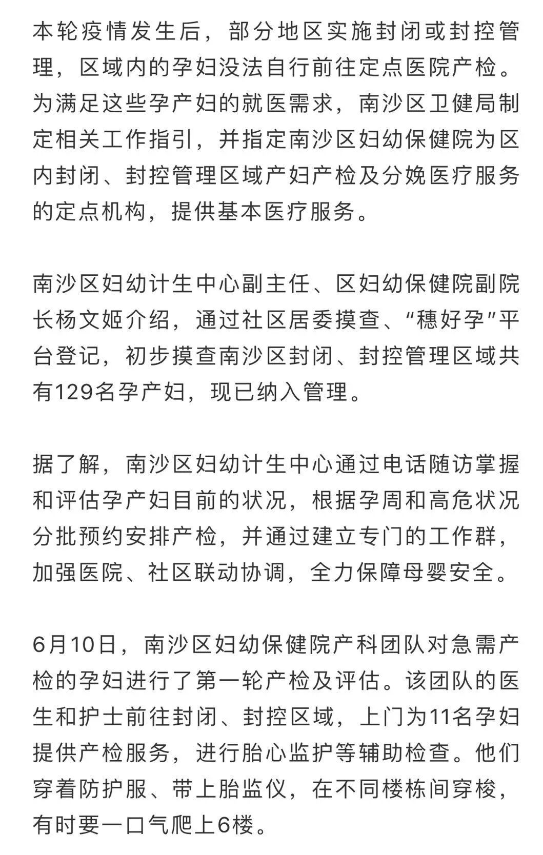 6月7日7时55分,南沙区妇幼保健院产科主任皮晓珍收到一位来自珠江街封闭管理小区嘉安花园的一名待产孕妇的微信,称其已经出现了规律性宫缩。这名孕妇此前曾在区妇幼保健院住院诊疗。7日10时17分,在社区、医院等合力协调下,这名孕妇由珠江街120救护车按照闭环管理要求,被紧急转送到了南沙区妇幼保健院产科隔离区域待产。8日凌晨,这名孕妇完成剖宫产手术,母子平安。
