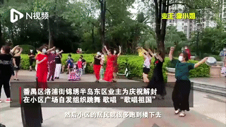 昨日下午,广州番禺区洛浦街锦绣半岛东区业主为庆祝解封,在小区广场自发组织跳舞,唱起《歌唱祖国》。