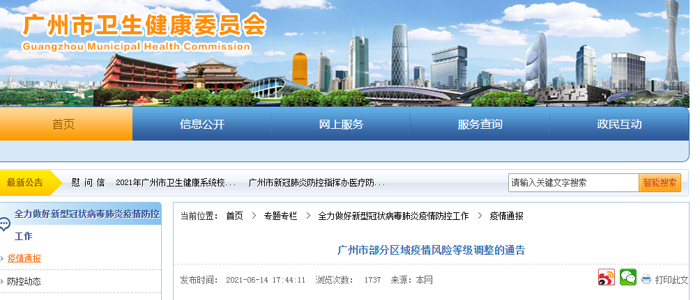 据通告,根据广东省新冠肺炎防控指挥办《关于印发广东省应对新型冠状病毒肺炎疫情分区分级防控工作指引的通知》,经广州市新冠肺炎防控指挥部同意,自2021年6月14日起,广州市部分区域疫情风险等级调整如下: