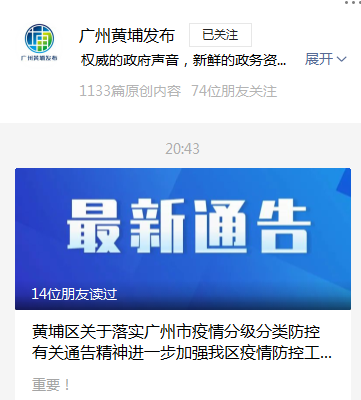 昨日(14日)晚上8时许,微信公众号“广州黄埔发布”通报了“黄埔区关于落实广州市疫情分级分类防控有关通告精神进一步加强我区疫情防控工作的通告(第3号)”。