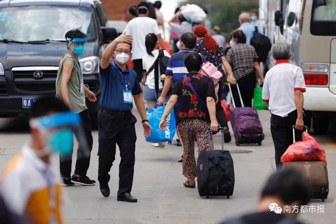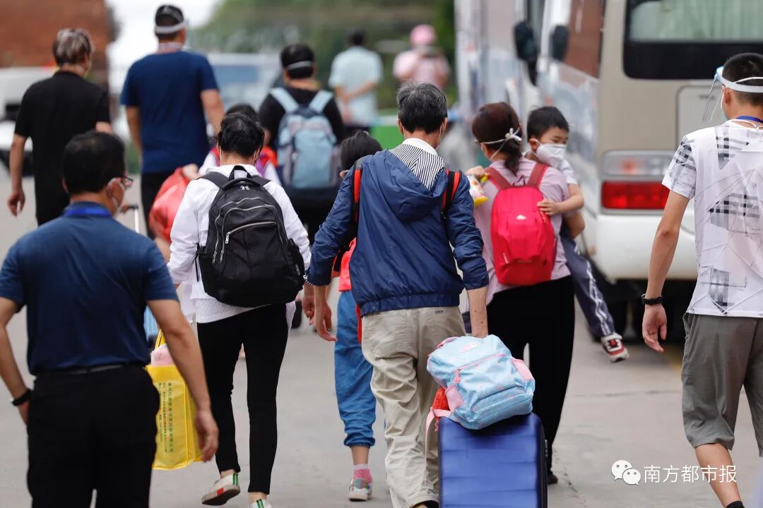 6月30日下午1点40分,在酒店隔离的鹤园小区居民有序回到小区。南都记者 何玉帅 摄