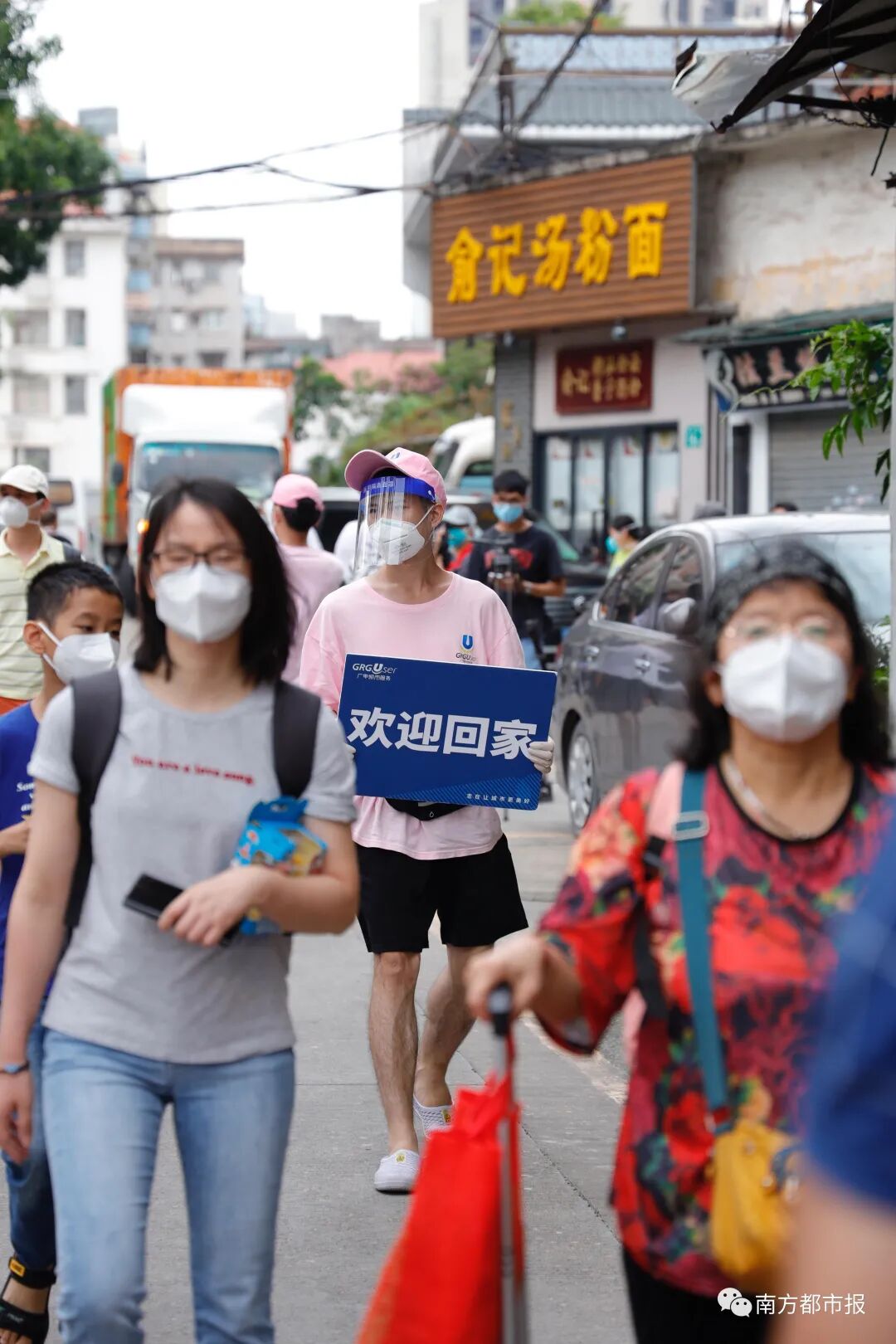志愿者举着“欢迎回家”的牌子迎接鹤园小区居民回家。南都记者 何玉帅 摄
