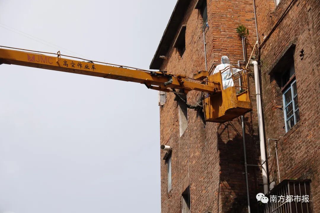 防疫人员正在对隔离居民的房屋外墙清除杂草之后消毒。南都记者 何玉帅 摄