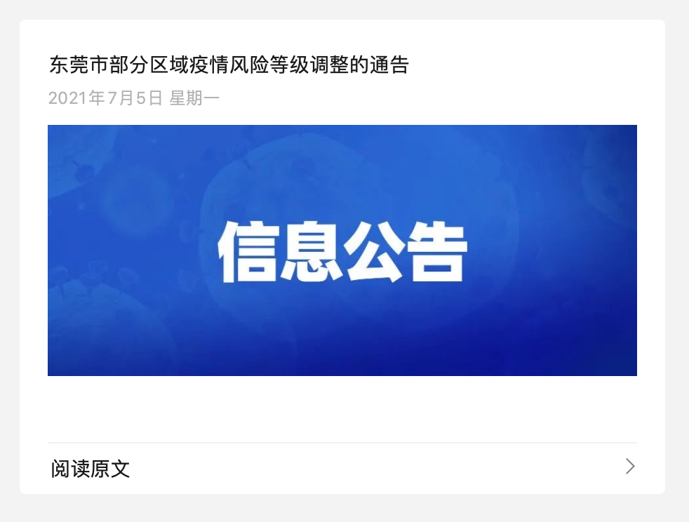 今早(5日),据微信公众号“莞香花开”,东莞市新型冠状病毒肺炎疫情防控指挥部办公室发布东莞市部分区域疫情风险等级调整的通告。