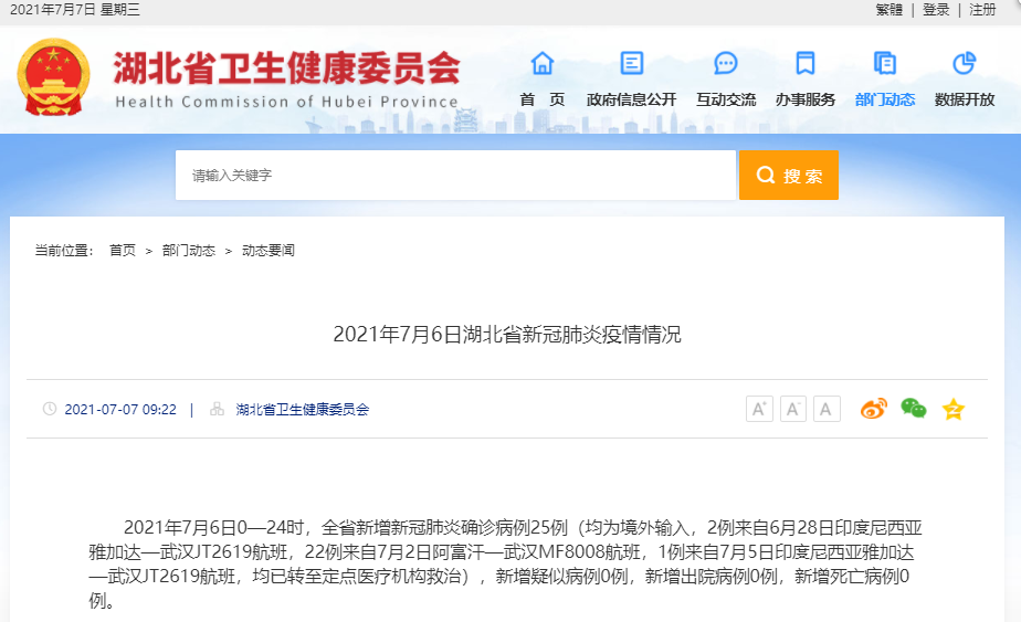 据湖北省卫健委官网今天(7月7日)上午9时22分消息: