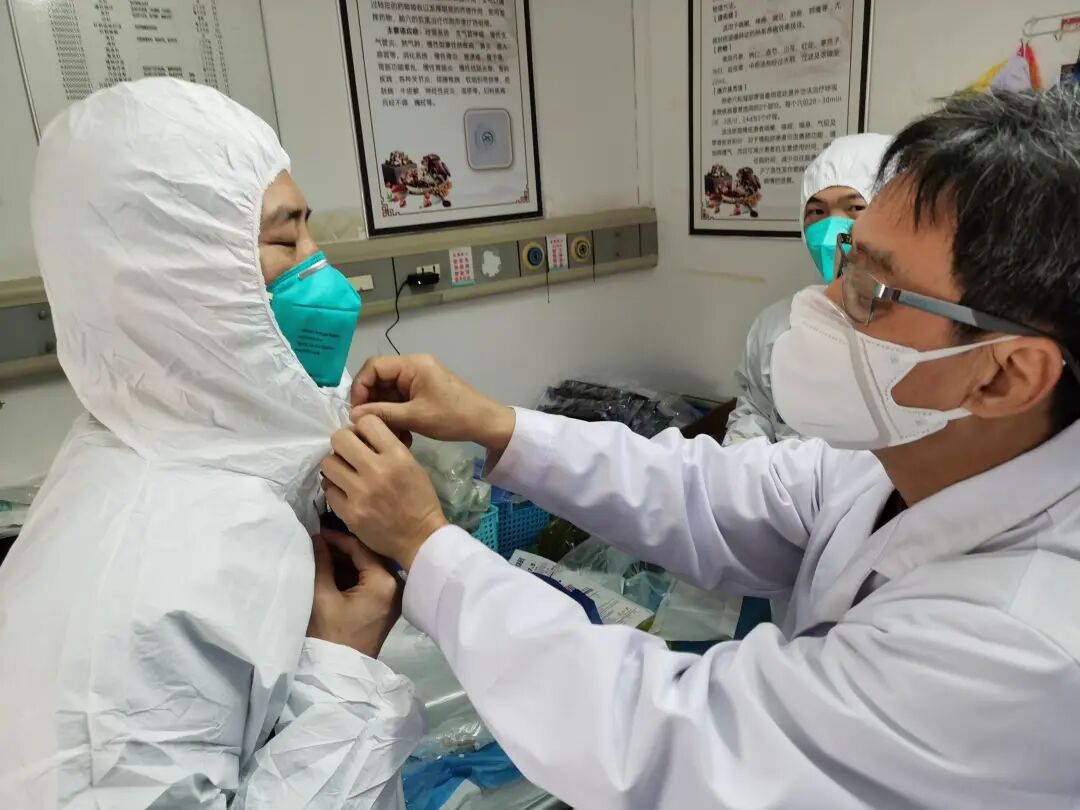 张忠德为援助湖北医疗队队员黄凯锋检查隔离衣。