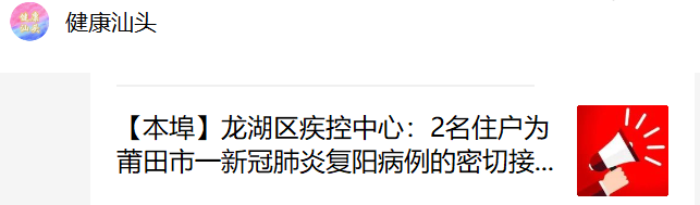 2021年7月9日晚,接市疾控中心通报,龙湖区珠池街道万豪南湾10栋2梯住户吴某楠、任某霞为福建省莆田市一名新冠肺炎复阳病例的密切接触者。