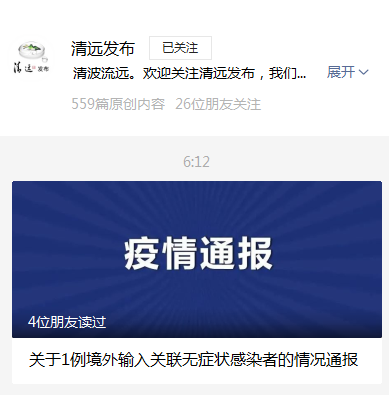 今日(20日)上午6时许,清远发布 披露“关于1例境外输入关联无症状感染者的情况通报”。