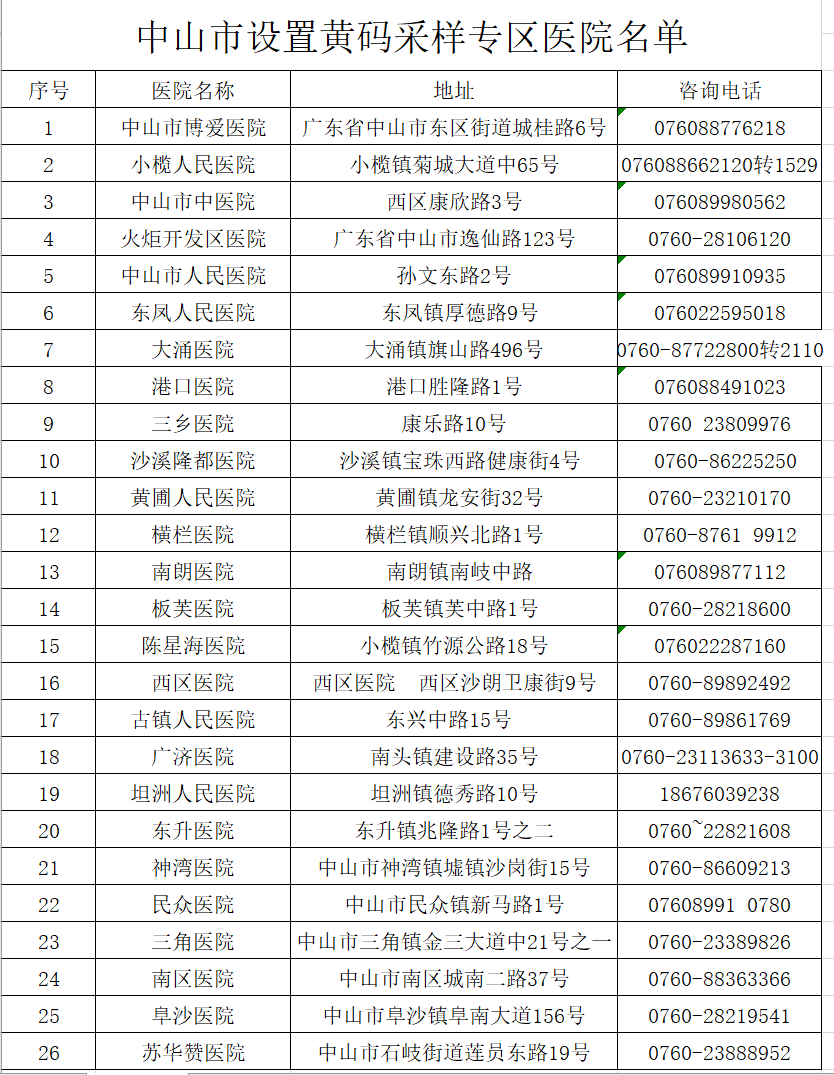 据悉,中山全市26家二级以上综合医院设立了“黄码”快速检测专区,请健康码“黄码”人员做好个人防护,就近检测。