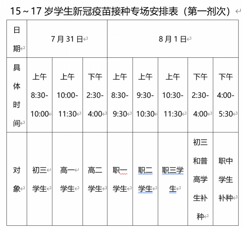2021年7月31日和8月1日开设学生专场,为学生接种第一剂次疫苗,第二剂次接种时间另行安排,计划于8月底完成。学生接种无需预约,请根据学校发布的各年级接种时间段安排,按时到居住地所在镇街新冠疫苗接种点进行接种,接种时学生必需有监护人陪同。若直系亲属中有需接种新冠疫苗的,也可同时前往,人数不超过3人,年龄在18-59岁范围内。接种时请服从镇街接种点的现场安排。