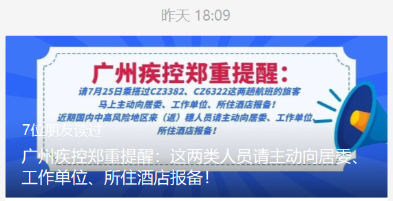 昨天(7月27日)18时许,广州市疾病预防控制中心发布提醒:请7月25日乘搭过CZ3382(南航 张家界 — 广州)、CZ6322(南航 广州 — 大连)这两趟航班的旅客马上主动向居委、工作单位、所住酒店报备!