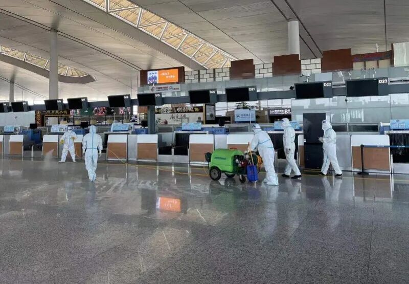 7月21日,工作人员在南京禄口机场T2航站楼内进行消杀。新华社发