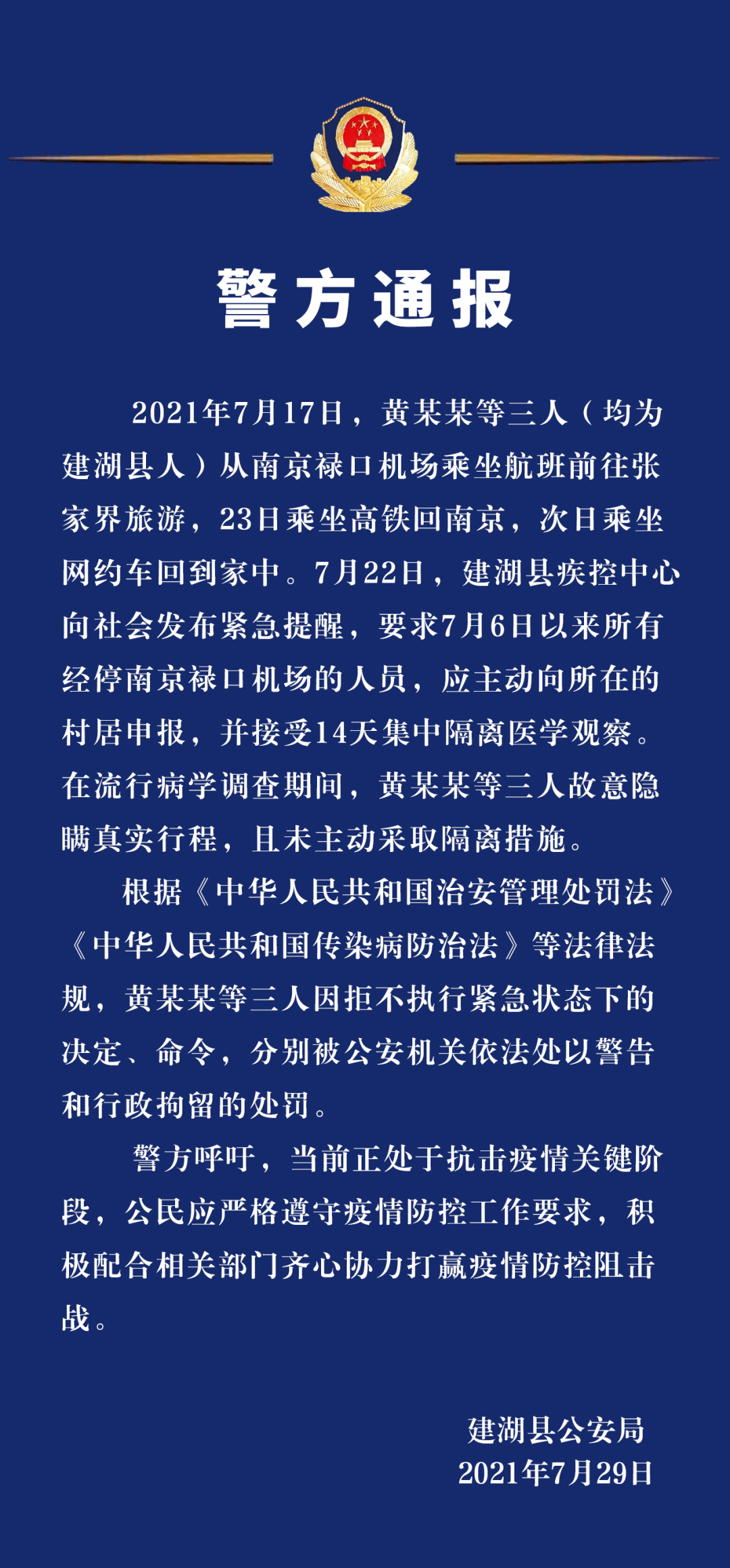 昨天(7月29日),江苏省盐城市建湖县公安局官方微博通报,该县黄某某等三人故意隐瞒曾从南京禄口机场乘坐航班前往张家界旅游的行程,且未主动采取隔离措施,分别被公安机关依法处以警告和行政拘留的处罚。