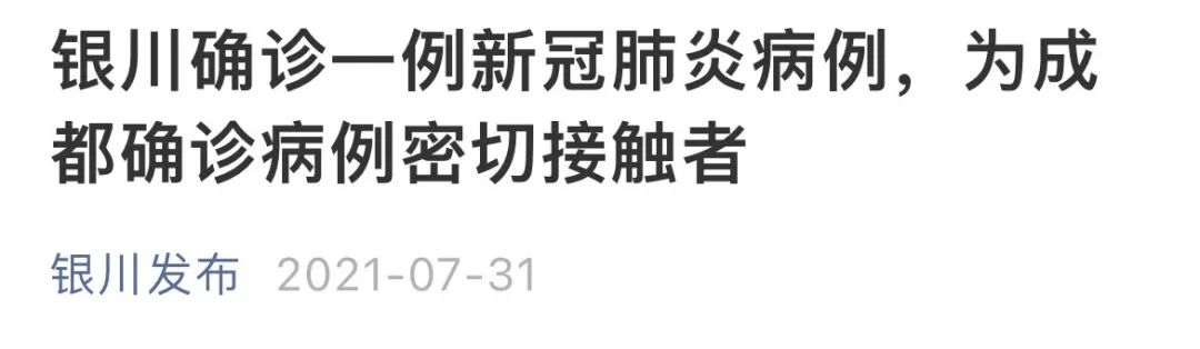 据宁夏银川发布,7月30日21:30,银川市根据相关省市协查函要求,组织对成都市确诊病例密切接触者张某某进行追踪排查,核酸检测阳性,立即转入自治区第四人民医院隔离诊疗,经自治区诊疗专家组诊断为新冠肺炎确诊病例,临床分型为轻型。目前,已对其密接、次密接人员、风险人员全面开展排查追踪管控。