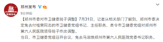 当日,市卫健委党组召开会议,免去马淑焕郑州市第六人民医院党委书记职务。