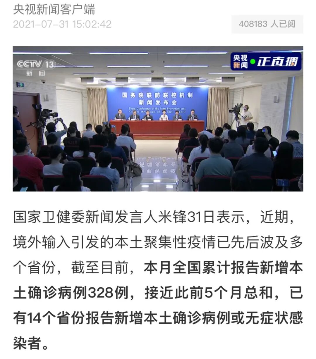 7月,全国累计报告新增本土确诊病例328例,接近此前5个月总和,已有14个省份报告新增本土确诊病例或无症状感染者。