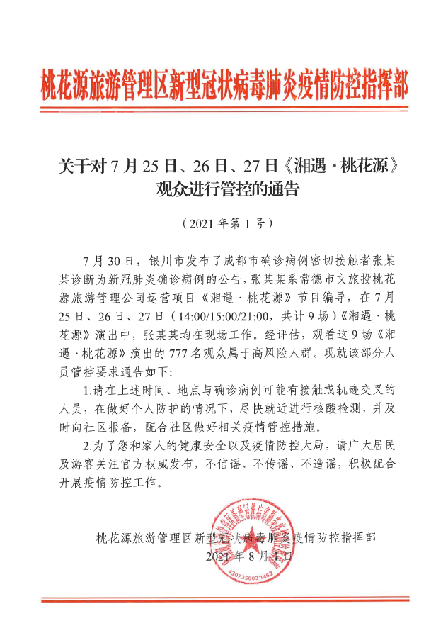 7月30日,宁夏银川市发布了成都市确诊病例密切接触者张某某诊断为新冠肺炎确诊病例的公告,张某某系常德市文旅投桃花源旅游管理公司运营项目《湘遇·桃花源》节目编导,在7月25日、26日、27日(14:00/15:00/21:00,共计9场)《湘遇·桃花源》演出中,张某某均在现场工作。经评估,观看这9场《湘遇·桃花源》演出的777名观众属于高风险人群。