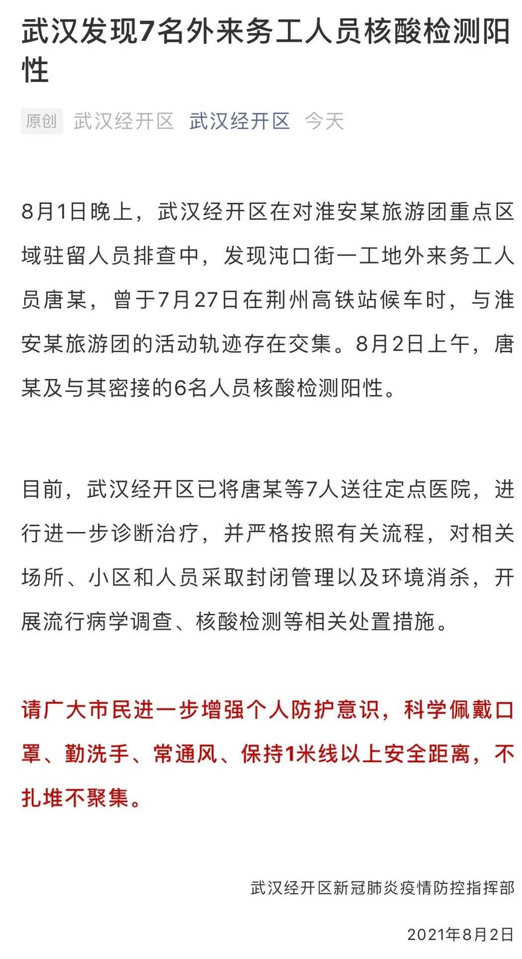 今日(2日)下午,据微信公号“武汉经开区”:8月1日晚上,湖北武汉经开区在对淮安某旅游团重点区域驻留人员排查中,发现沌口街一工地外来务工人员唐某,曾于7月27日在荆州高铁站候车时,与淮安某旅游团的活动轨迹存在交集。8月2日上午,唐某及与其密接的6名人员核酸检测阳性。