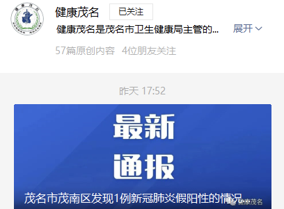 昨天(8月2日),据健康茂名消息,广东省茂名市新型冠状病毒肺炎疫情防控指挥部办公室发布通报,在此前新冠病毒快速筛查中发现的一例可疑阳性样本,双试剂复核检测结果均为阴性。经专家讨论排除新冠病毒感染后,解除相关区域的全封闭管控。