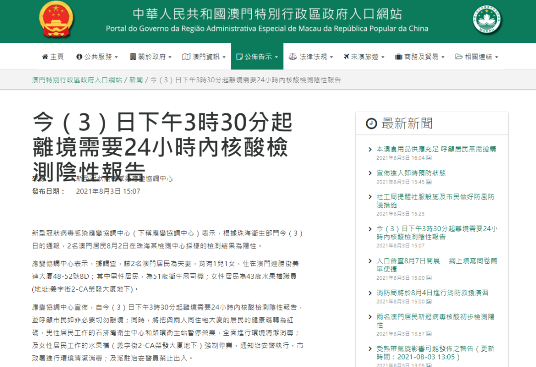 应变协调中心宣布,自今(3)日下午3时30分起离境需要24小时内核酸检测阴性报告,并呼吁市民如非必要切勿离境;同时,将把与两人同住宅大厦的居民的健康码转为红码,男性居民工作的石排湾卫生中心和路环卫生站暂停营业,全面进行环境清洁消毒;及女性居民工作的水果檔(义字街2-CA荣发大厦地下)强制停业,通知治安警执行,市政署进行环境清洁消毒;及派驻治安警员禁止出入。