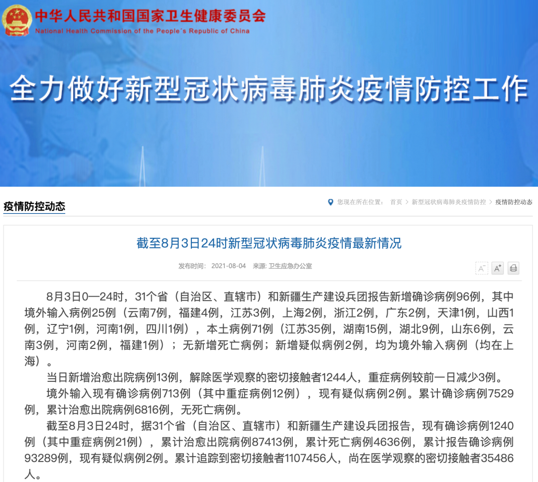 据国家卫健委今天(4日)通报,8月3日0—24时,31个省(自治区、直辖市)和新疆生产建设兵团报告新增确诊病例96例,其中境外输入病例25例(云南7例,福建4例,江苏3例,上海2例,浙江2例,广东2例,天津1例,山西1例,辽宁1例,河南1例,四川1例),本土病例71例(江苏35例,湖南15例,湖北9例,山东6例,云南3例,河南2例,福建1例);无新增死亡病例;新增疑似病例2例,均为境外输入病例(均在上海)。