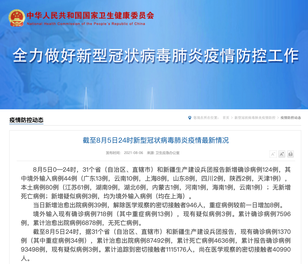据国家卫健委6日通报,8月5日0—24时,31个省(自治区、直辖市)和新疆生产建设兵团报告新增确诊病例124例,其中境外输入病例44例(广东13例,云南10例,上海8例,山东8例,四川2例,陕西2例,天津1例),本土病例80例(江苏61例,湖南9例,湖北6例,内蒙古1例,河南1例,海南1例,云南1例);无新增死亡病例;新增疑似病例3例,均为境外输入病例(均在上海)。