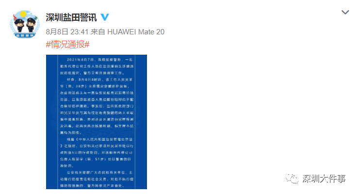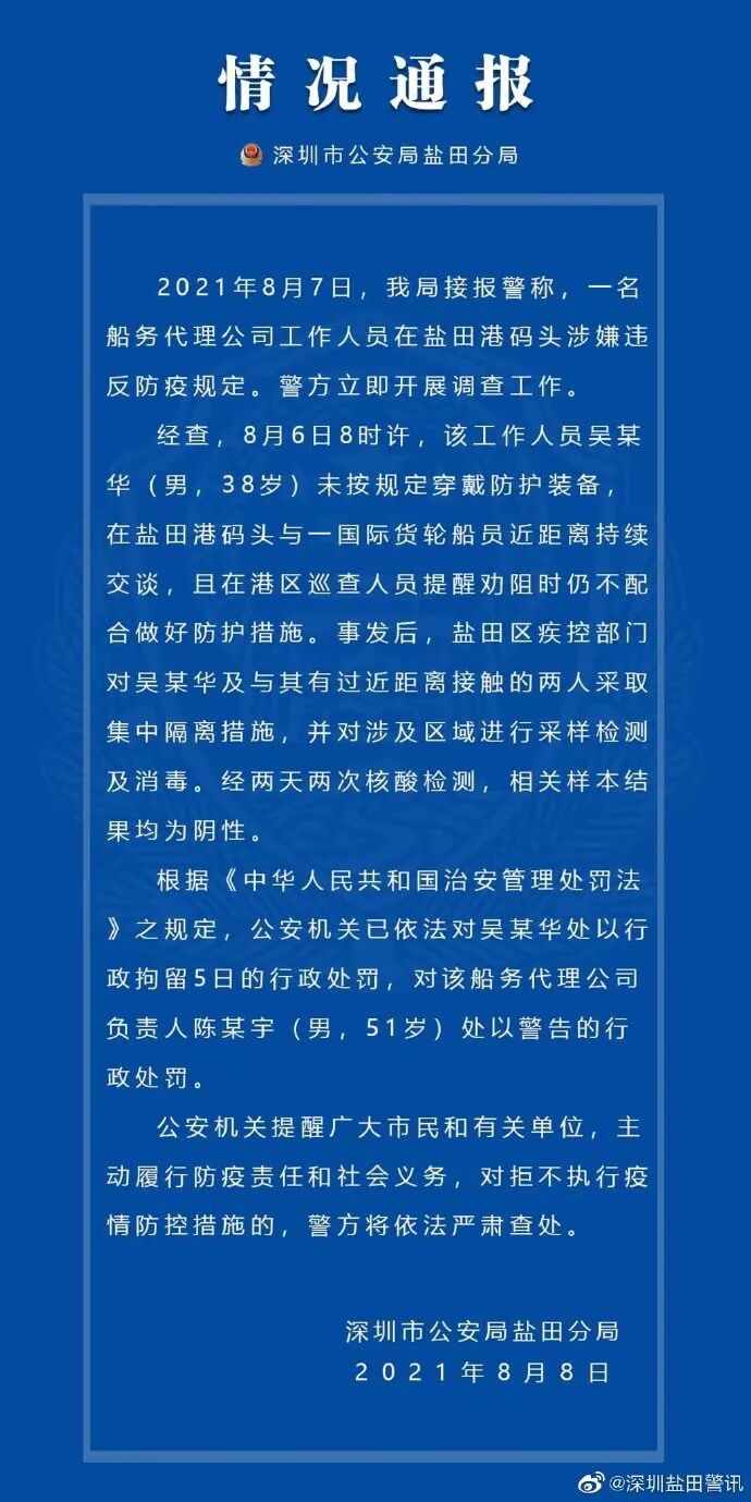 2021年8月7日,深圳市公安局盐田分局接报警称,一名船务代理公司工作人员在盐田港码头涉嫌违反防疫规定。警方立即开展调查工作。