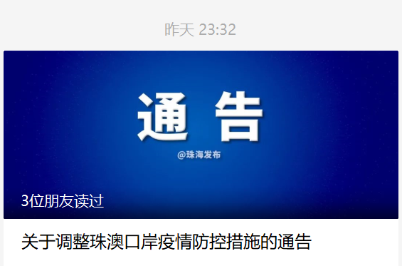 昨天深夜,广东珠海市新型冠状病毒肺炎疫情防控指挥部办公室发布“关于调整珠澳口岸疫情防控措施的通告”: