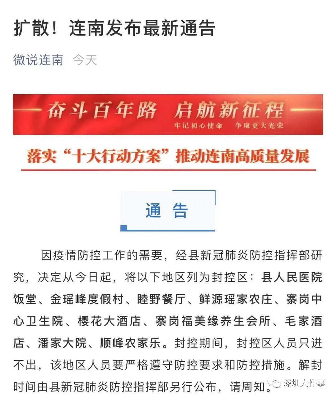 连南县新冠肺炎疫情防控指挥部办公室发布公告,因疫情防控工作的需要,经县新冠肺炎防控指挥部研究,决定从9日起,将以下地区列为封控区:县人民医院饭堂、金瑶峰度假村、睦野餐厅、鲜源瑶家农庄、寨岗中心卫生院、樱花大酒店、寨岗福美缘养生会所、毛家酒店、潘家大院、顺峰农家乐。