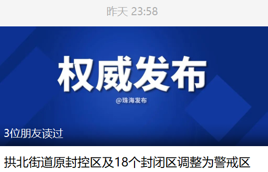 根据当前珠海市疫情防控工作情况,经综合评估,自8月11日6时起,将以下区域调整为警戒区域,实行“两点(居住点-工作点)一线,非必要不离开”管理措施: