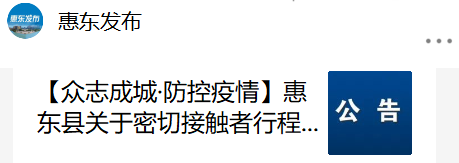 昨天深夜23时59分,微信公众号“惠东发布”发布《惠州市惠东县关于密切接触者行程轨迹的公告》: