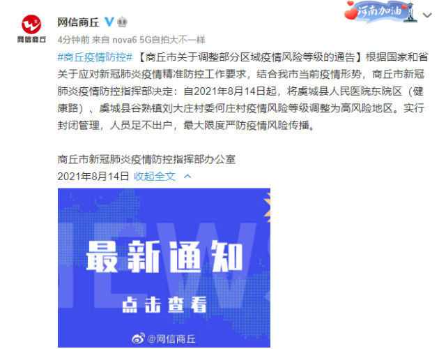 根据国家和省关于应对新冠肺炎疫情精准防控工作要求,结合我市当前疫情形势,商丘市新冠肺炎疫情防控指挥部决定:自2021年8月14日起,将虞城县人民医院东院区(健康路)、虞城县谷熟镇刘大庄村委何庄村疫情风险等级调整为高风险地区。实行封闭管理,人员足不出户,最大限度严防疫情风险传播。