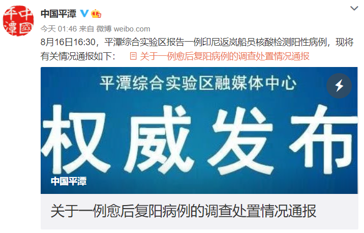 今天(8月17日)凌晨1:46,@中国平潭发布通告称,福建平潭综合实验区报告一例印尼返岚船员核酸检测阳性病例。