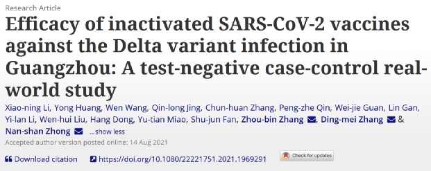 据“南山呼吸”消息,国产新冠疫苗应对Delta亚株真实世界研究正式发表,广州市疾病预防控制中心联合中国工程院院士钟南山团队以及中山大学公共卫生学院张定梅副教授团队,以广州市今年5月至6月新冠疫情中的病例及密切接触者为研究对象,通过检测—阴性设计的病例对照研究,估算出中国国产新冠病毒疫苗应对Delta变异株的保护效果。
