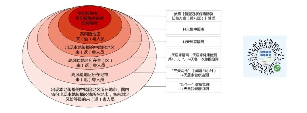 上述人员来(返)粤实施“四个一”健康管理,即:发放一份健康告知书、开展一次健康问询、查验一次健康码、开展一次核酸检测。同时实施14天居家健康监测。