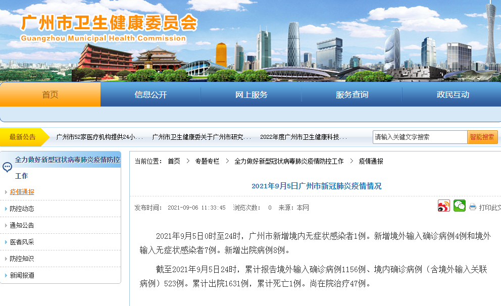 据通报,2021年9月5日0时至24时,广州市新增境内无症状感染者1例。新增境外输入确诊病例4例和境外输入无症状感染者7例。新增出院病例8例。