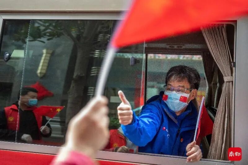 2020年4月5日,湖北武汉,广东省中医院副院长“德叔”张忠德从酒店驻地出发前往机场,武汉当地政府官员和市民志愿者前来送行。张忠德1月24日除夕来到武汉战疫。