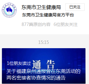 据“东莞市卫生健康局”公众号今天(9月15日)15点15分消息,东莞市疾病预防控制中心发布通报称,9月14日,福建泉州台商投资区防控新型冠状病毒感染的肺炎疫情应急指挥部办公室通报该区发现2名莆田疫情相关人员新冠病毒核酸阳性吴某的密切接触者。