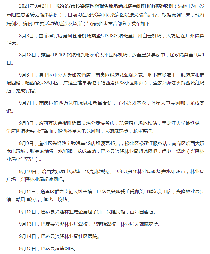 昨天(9月21日),据哈尔滨市政府新闻办的疫情防控专场新闻发布会消息:2021年9月21日0-18时,哈尔滨市发现新冠肺炎确诊病例3例。9月22日“哈尔滨发布”公众号发布病例活动轨迹。