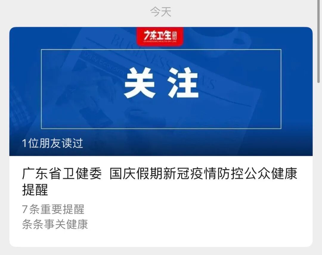 今日(10月1日),广东省卫生健康委发布国庆节假期新冠肺炎疫情防控公众健康提醒: