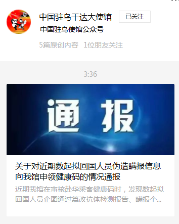 今日(2日)凌晨3时许,中国驻乌干达大使馆在其微信公号发布《关于对近期数起拟回国人员伪造瞒报信息向我馆申领健康码的情况通报》。